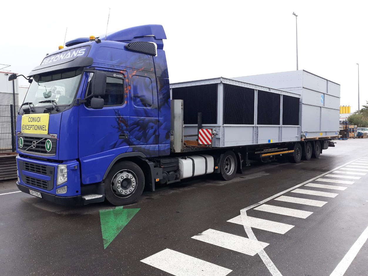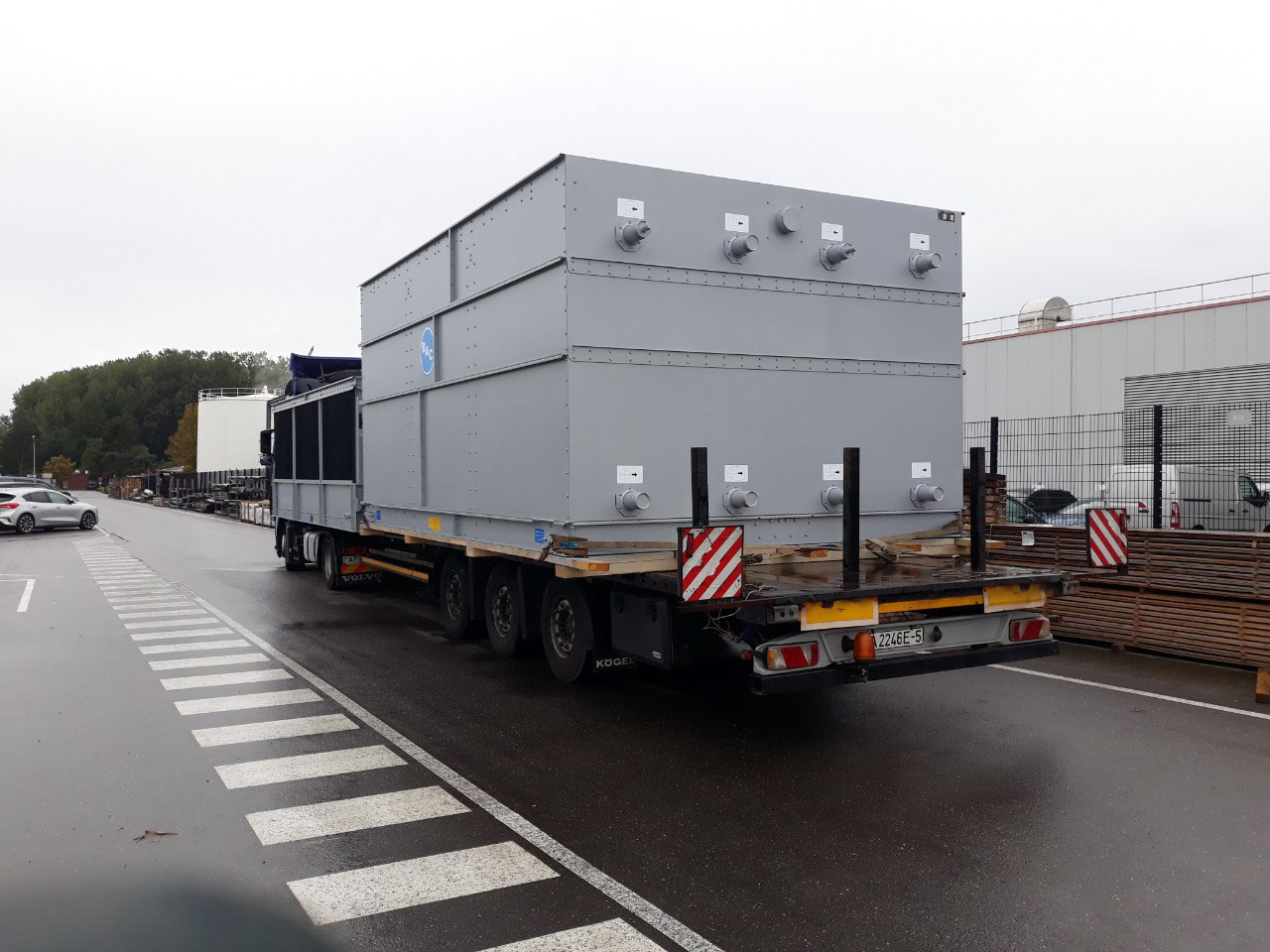 Проектная перевозка на поставку части линии климатической системы – градирня производства Baltimore Aircoil International N.V. Перевозка градирни производилась в разобранном виде на 12 автопоездах. Каждая часть была с габаритами 3,65м ширина, 3,4м высота. Негабаритные перевозки с такими параметрами осуществляются с сопровождением автомобилями прикрытия по всему маршруту. Важным условием перевозки являлась единовременная поставка всей партии на таможню назначения в России.